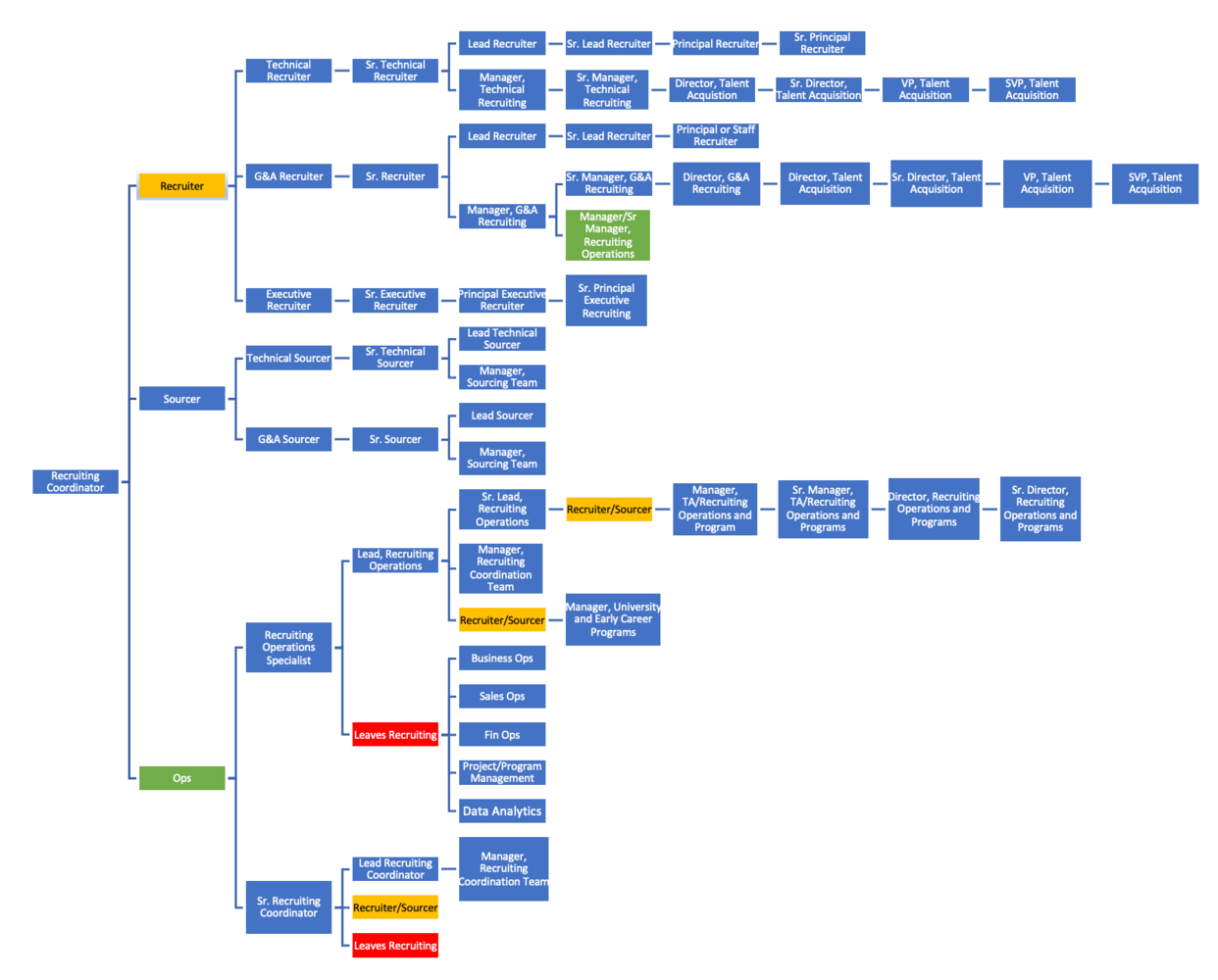 Before you panic at the giant chart, you have to understand that for most Recruiting Operations professionals to advance to a Recruiting Operations Manager or above, they will generally feel they need to leave Ops and become a Recruiter to get enough experience and the right vocabulary to speak confidently to leadership. This viewpoint is completely understandable as many job descriptions will look for 2-5 years of full-cycle recruiting experience and many companies look for Recruiters, who have a strong process focus. This Recruiting experience does have a direct correlation for some success in Recruiting Ops as it rounds out the knowledge of Recruiting overall and provides the necessary vernacular to communicate within a wider People team.