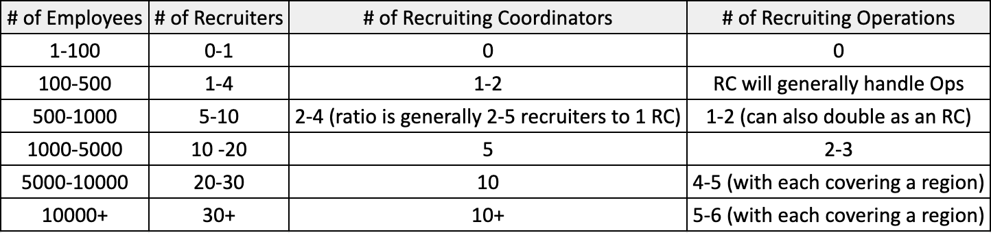 The size of the company will dictate the size of the Recruiting Operations team. Generally speaking, the number of Recruiting Coordinators and Recruiting Operations people will be relative to the size of the organization and their recruiting teams. Many organizations choose to keep a ratio of 4 Recruiters to 1 Recruiting Coordinator and 5 Recruiting individuals to 1 Recruiting Ops person. In most cases, it will look something like this: